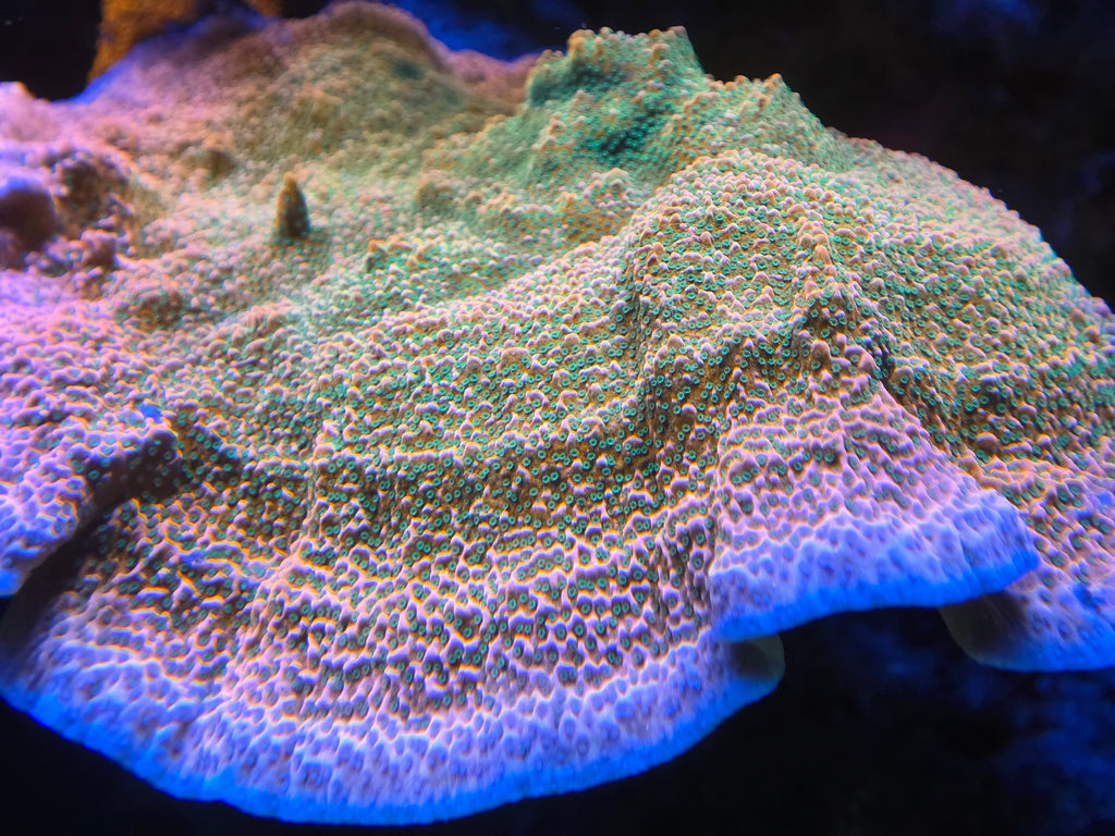The Tropic Thunder Montipora is a show-stopping encrusting SPS coral, featuring a deep red to purple base covered in vibrant neon green polyps. This high-contrast combo creates a dramatic look that stands out in any reef. Hardy and fast-growing under stable conditions, it's a perfect choice for reefers looking to add bold color and texture to their SPS collection.