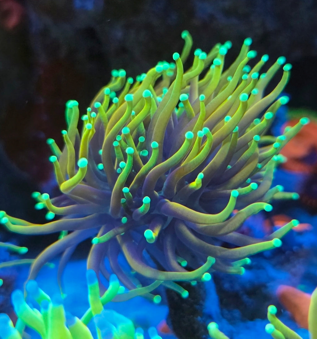 Ignite your reef with the intense glow of the Hellfire Torch — a true collector’s piece known for its blazing coloration and captivating movement. Featuring bright golden-yellow tentacles with vibrant orange and green hues, this coral lives up to its fiery name. Under blues, it radiates with molten energy, becoming an instant focal point in any reef display.